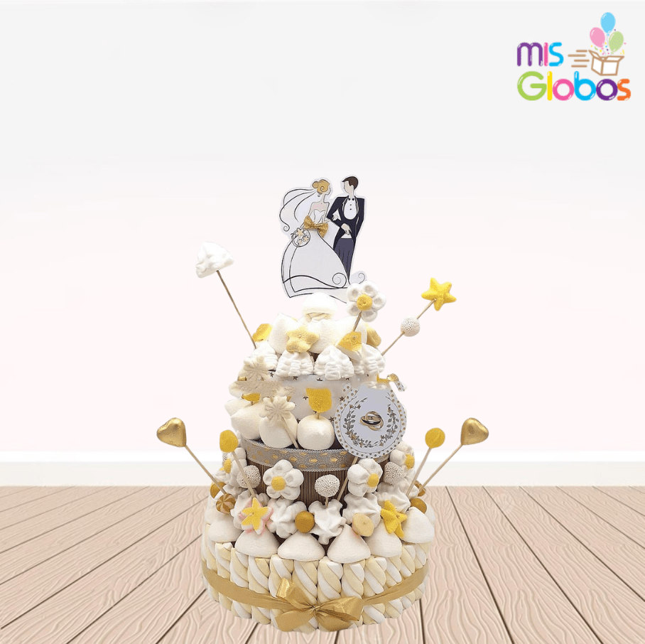 Tarta de chuches Boda blanca oro