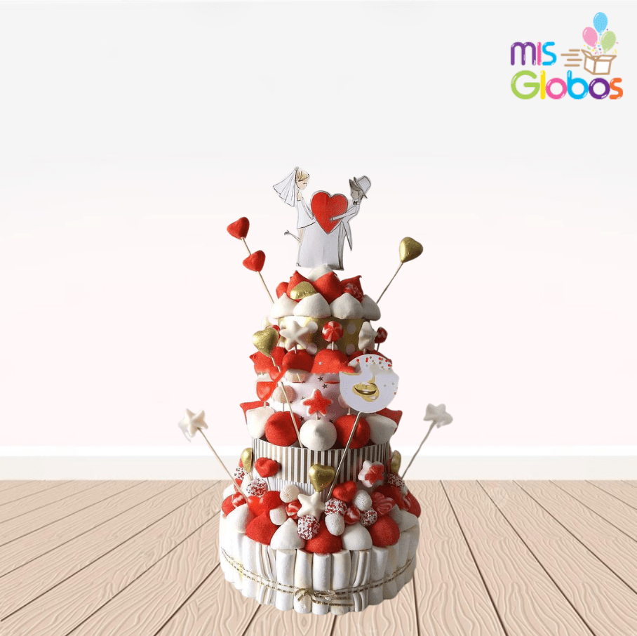 Tarta de chuches Boda blanca oro y rojo